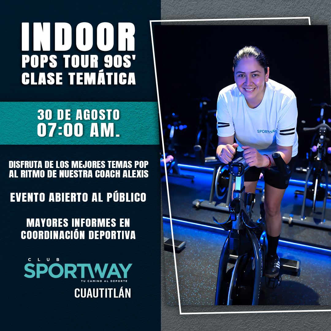 Indoor • 90’s Pops tour es una clase temática que se llevará a cabo el próximo 30 de agosto a las 07:00 am. Prepárate para una sesión llena de energía, música y ambiente veraniego junto a nuestra Coach Alexis, quien te guiará al ritmo de estas canciones emblemáticas.